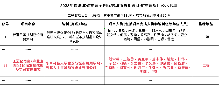 2023年11月30日,湖北省城市規(guī)劃協(xié)會(huì)公示了2023年度湖北省推薦全國(guó)優(yōu)秀城市規(guī)劃設(shè)計(jì)獎(jiǎng)推薦項(xiàng)目名單,湖北天工建筑勘察設(shè)計(jì)有限公司聯(lián)合華中科技大學(xué)完成的“江夏區(qū)南部(農(nóng)業(yè)生態(tài)區(qū))區(qū)域發(fā)展戰(zhàn)略及空間布局研究”項(xiàng)目榮獲二等獎(jiǎng),并計(jì)劃申報(bào)國(guó)家級(jí)獎(jiǎng)項(xiàng)!(撰稿人:李媛)
